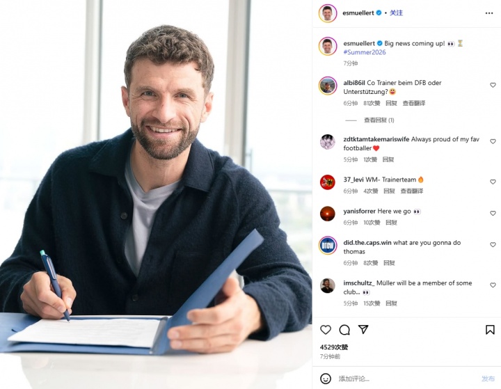 Muller đã cập nhật một bài đăng trên mạng xã hội hôm nay và viết: Tin tức lớn sắp được công bố với hashtag #2026summer# đã khơi dậy trí tưởng tượng vô tận của người hâm mộ. Một số người hâm mộ đồn đoán trên mạng xã hội của Muller rằng anh có thể tham dự World Cup 2026 với tư cách thành viên ban huấn luyện.