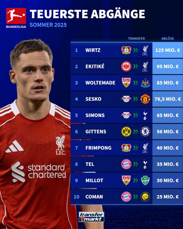 Cửa sổ mùa hè Bundesliga đã kết thúc và "Thị trường chuyển nhượng" cũng tính những người bán đắt nhất trong Bundesliga vào mùa hè này, với Wilz dẫn đầu.